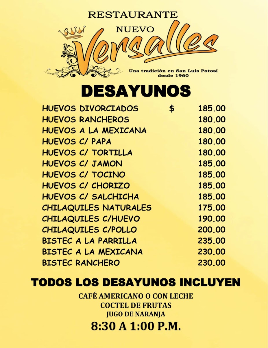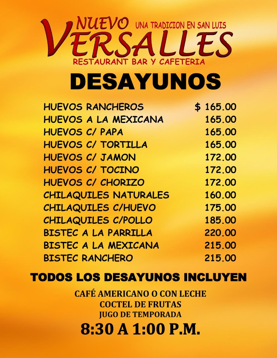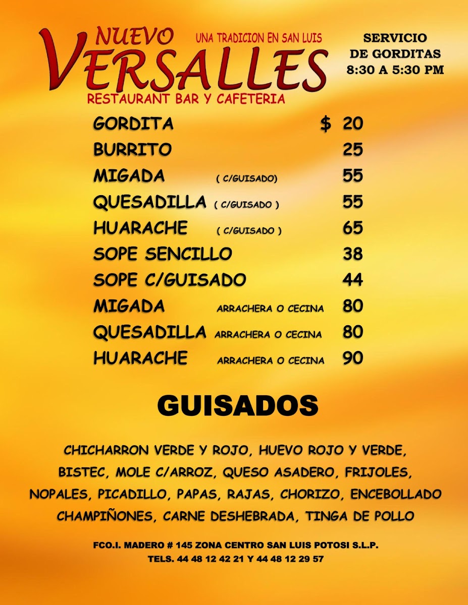 Nestled in the heart of San Luis Potosí, Restaurant Nuevo Versalles offers a vibrant taste of authentic Mexican cuisine with a focus on traditional guisados. Their menu bursts with classic flavors, featuring chicharrón verde y rojo, mole with rice, and queso asadero, each dish crafted with care and rich local ingredients. Patrons rave about their enchiladas and tacos potosinos, specialties that capture the essence of regional culinary heritage. Breakfast lovers will appreciate the comforting huevo rojo y verde and the inviting café con leche, praised for its smooth, warm embrace.