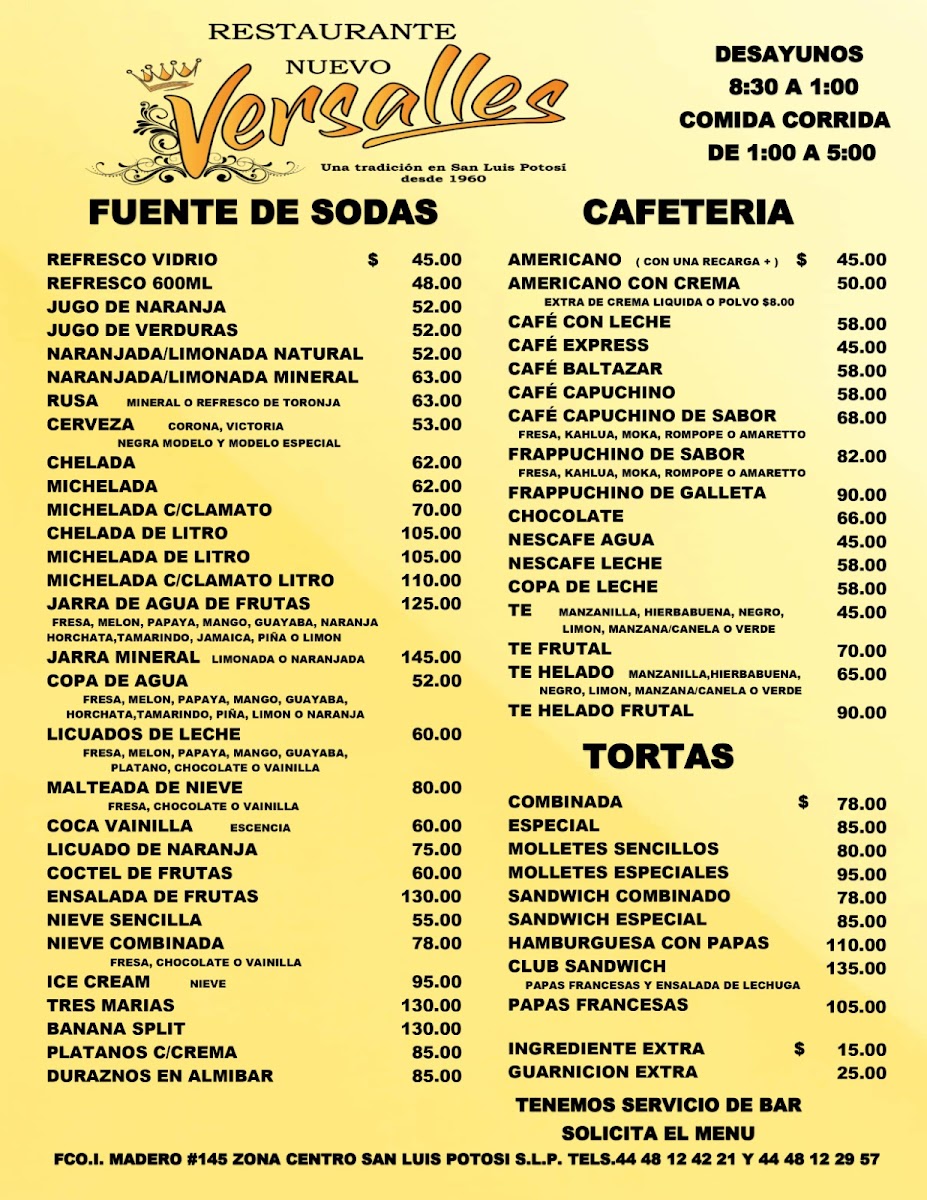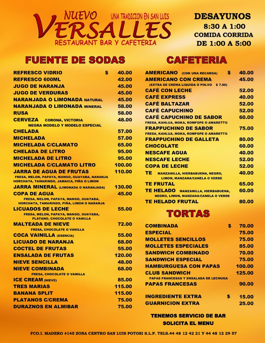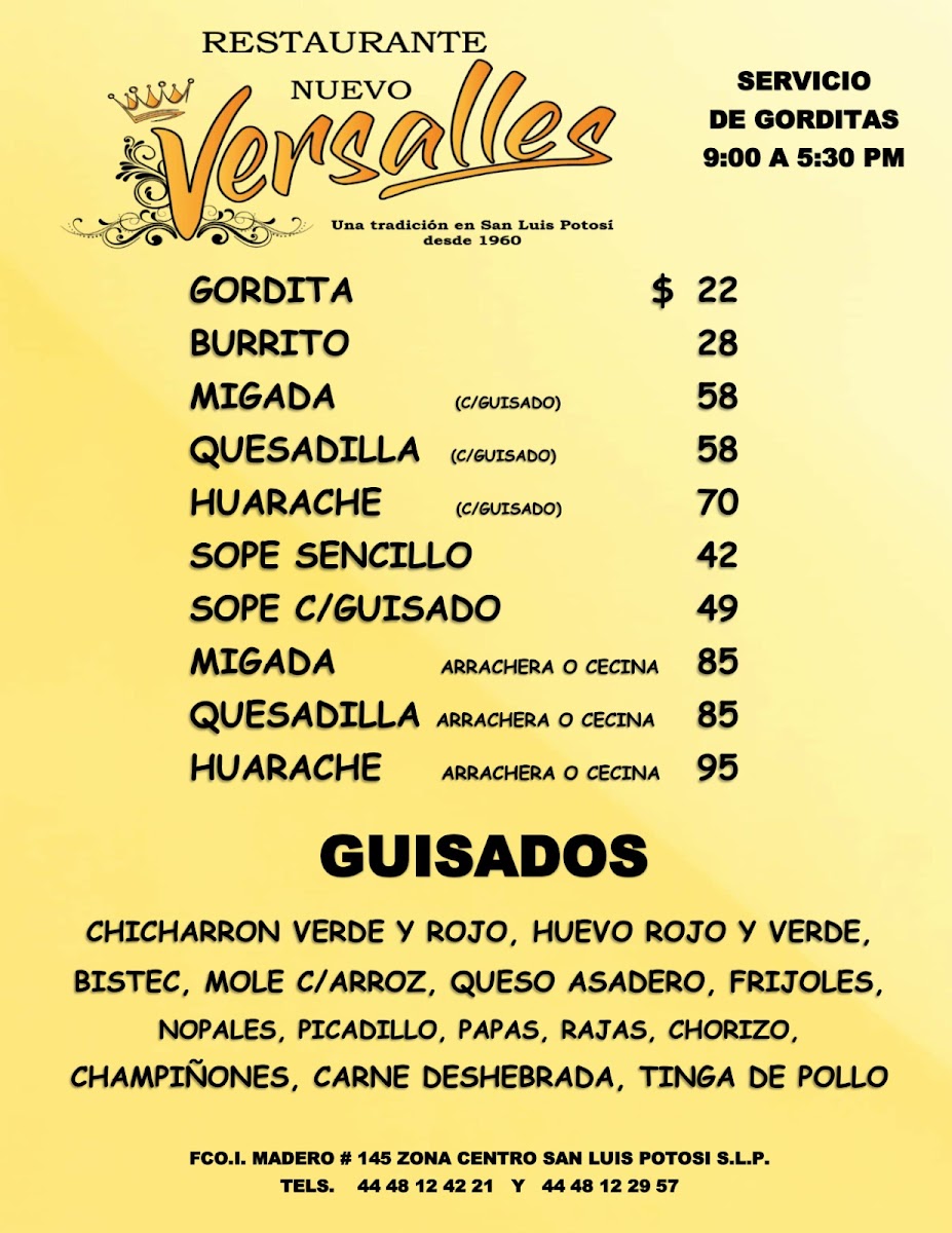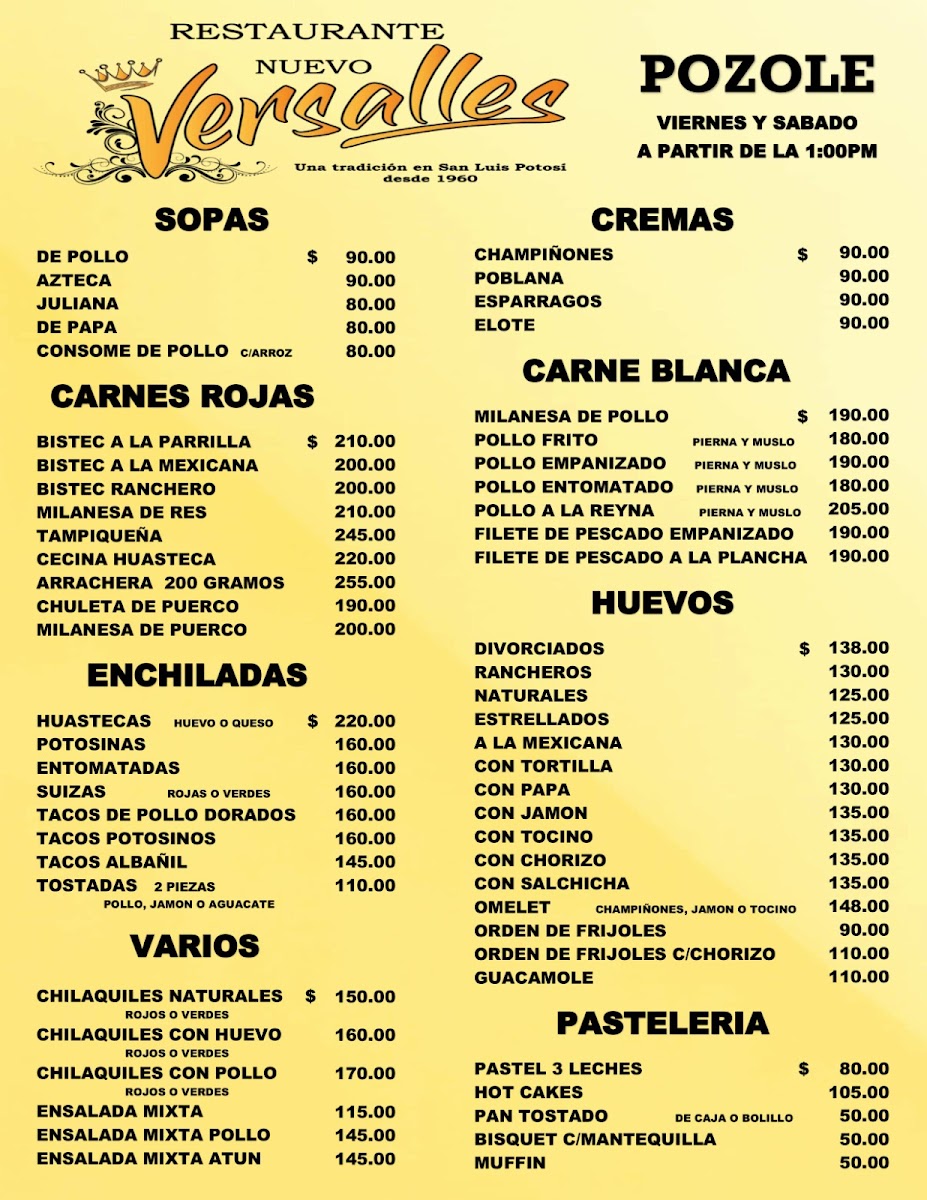 Nestled in the heart of San Luis Potosí, Restaurant Nuevo Versalles offers a vibrant taste of authentic Mexican cuisine with a focus on traditional guisados. Their menu bursts with classic flavors, featuring chicharrón verde y rojo, mole with rice, and queso asadero, each dish crafted with care and rich local ingredients. Patrons rave about their enchiladas and tacos potosinos, specialties that capture the essence of regional culinary heritage. Breakfast lovers will appreciate the comforting huevo rojo y verde and the inviting café con leche, praised for its smooth, warm embrace.